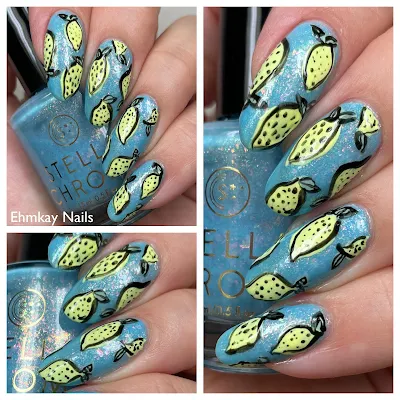 Lovely follower and amazing commenter Tami knows how much I love fruit print: on my nails and on my clothes! She alerted me to a fantastic bathing suit with lemons and you know I absolutely saved the image of the bathing suit to eventually put on my nails!